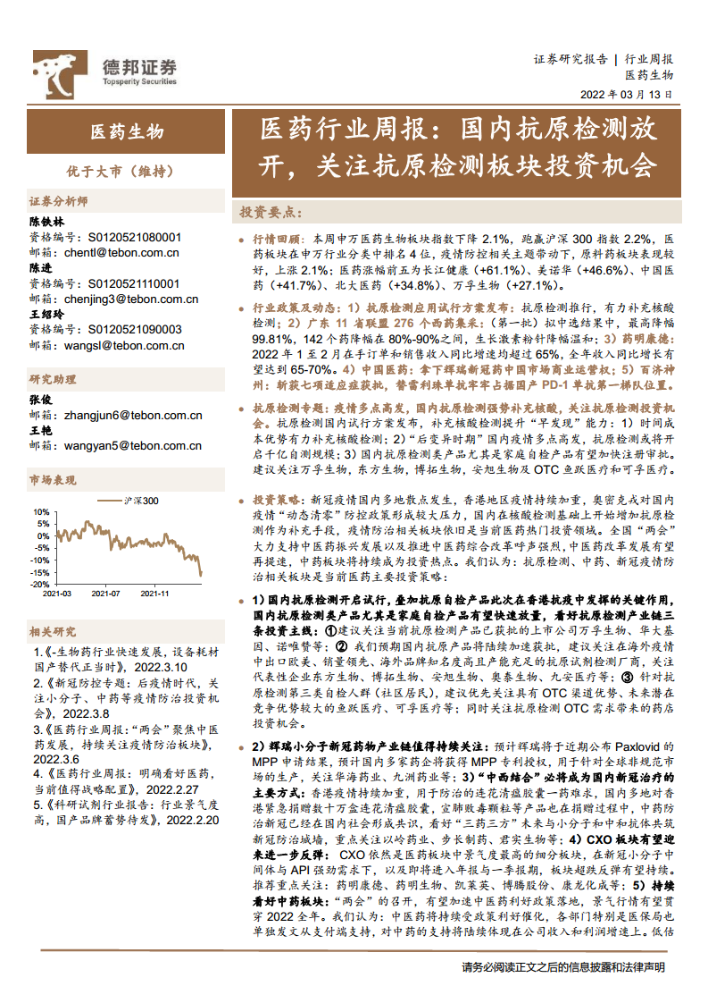 医药行业周报:国内抗原检测放开,关注抗原检测板块投资机会