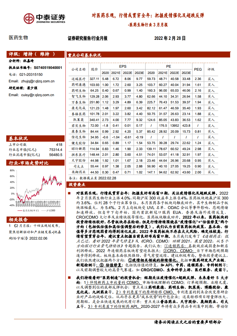 医药生物行业3月月报:对医药乐观,行情或贯穿全年:把握疫情催化及超跌反弹