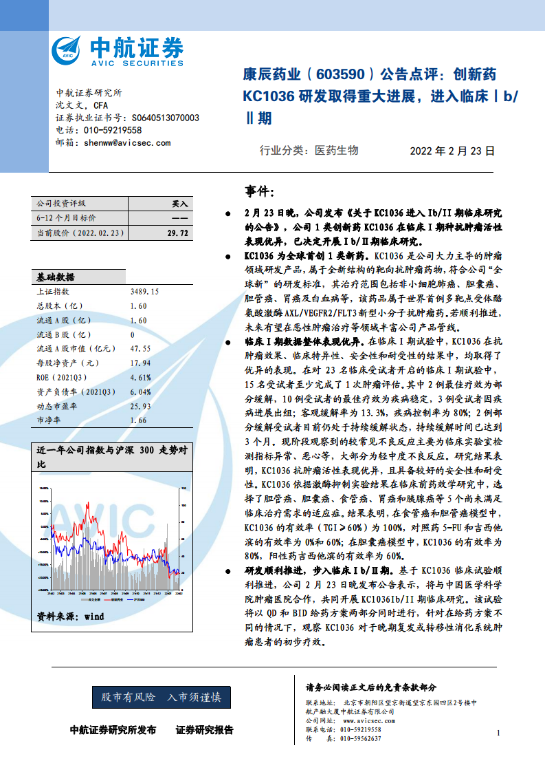 康辰药业(603590)公告点评:创新药KC1036研发取得重大进展,进入临床Ⅰb、Ⅱ期