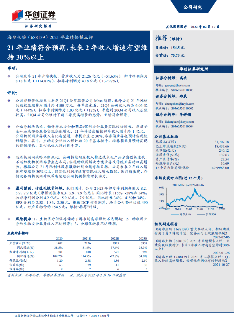 海尔生物(688139)2021年业绩快报点评:21年业绩符合预期,未来2年收入增速有望维持30%以上