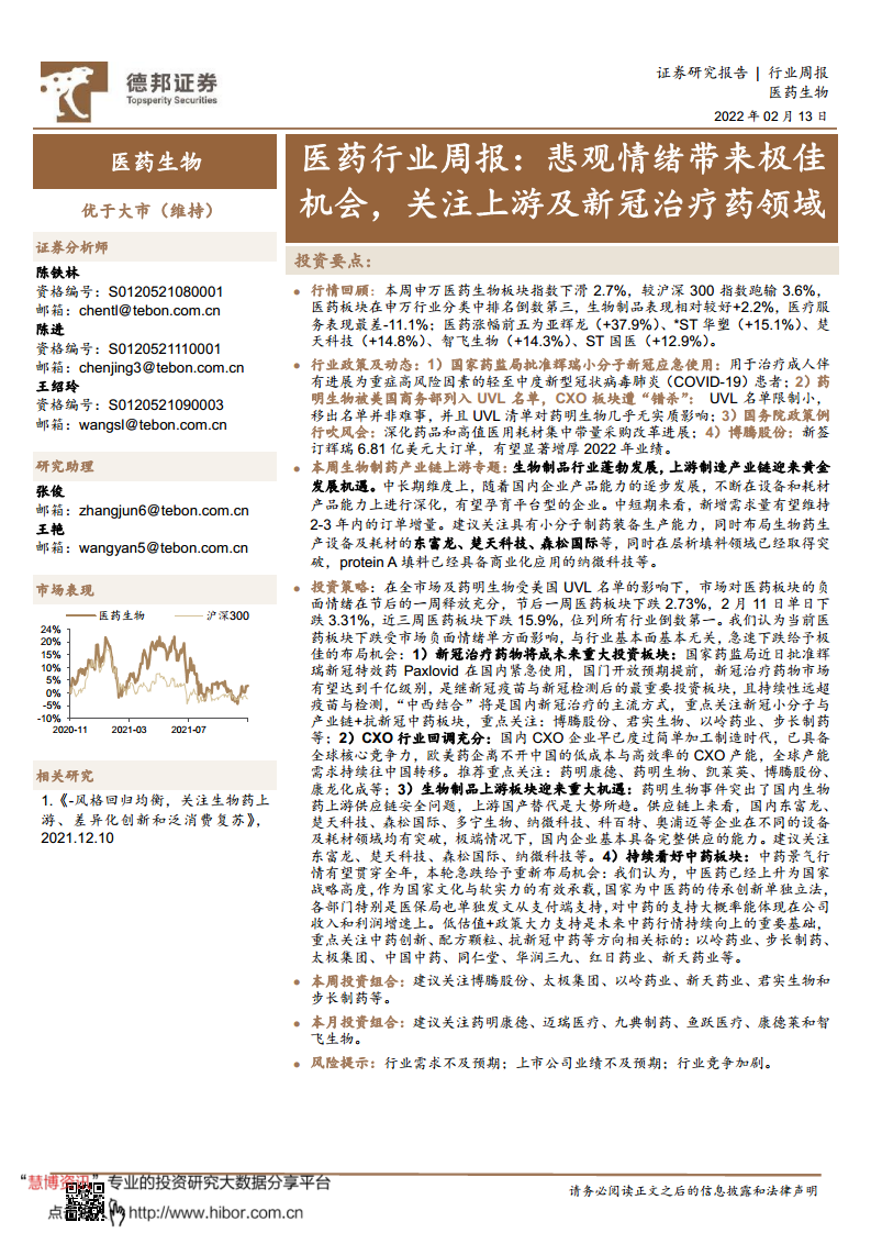 医药行业周报:悲观情绪带来极佳机会,关注上游及新冠治疗药领域