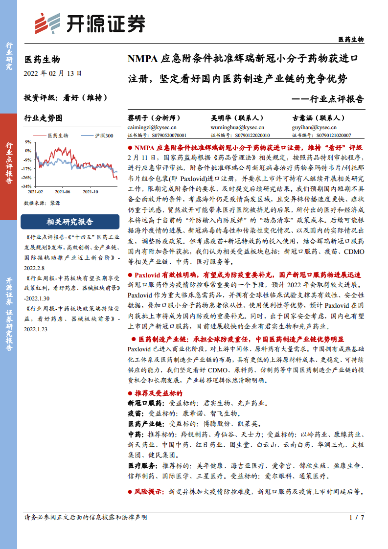 医药生物行业点评报告:NMPA应急附条件批准辉瑞新冠小分子药物获进口注册,坚定看好国内医药制造产业链的竞争优势