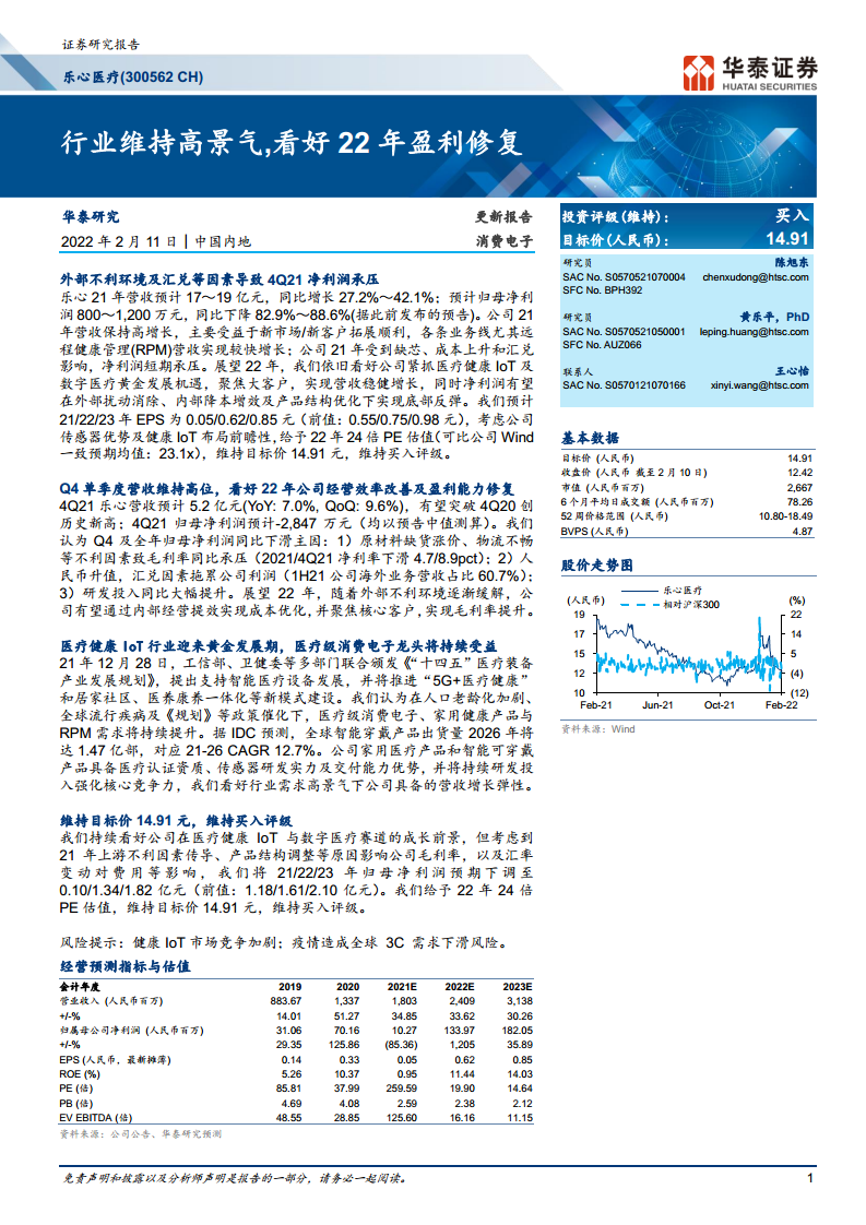乐心医疗(300562):行业维持高景气,看好22年盈利修复