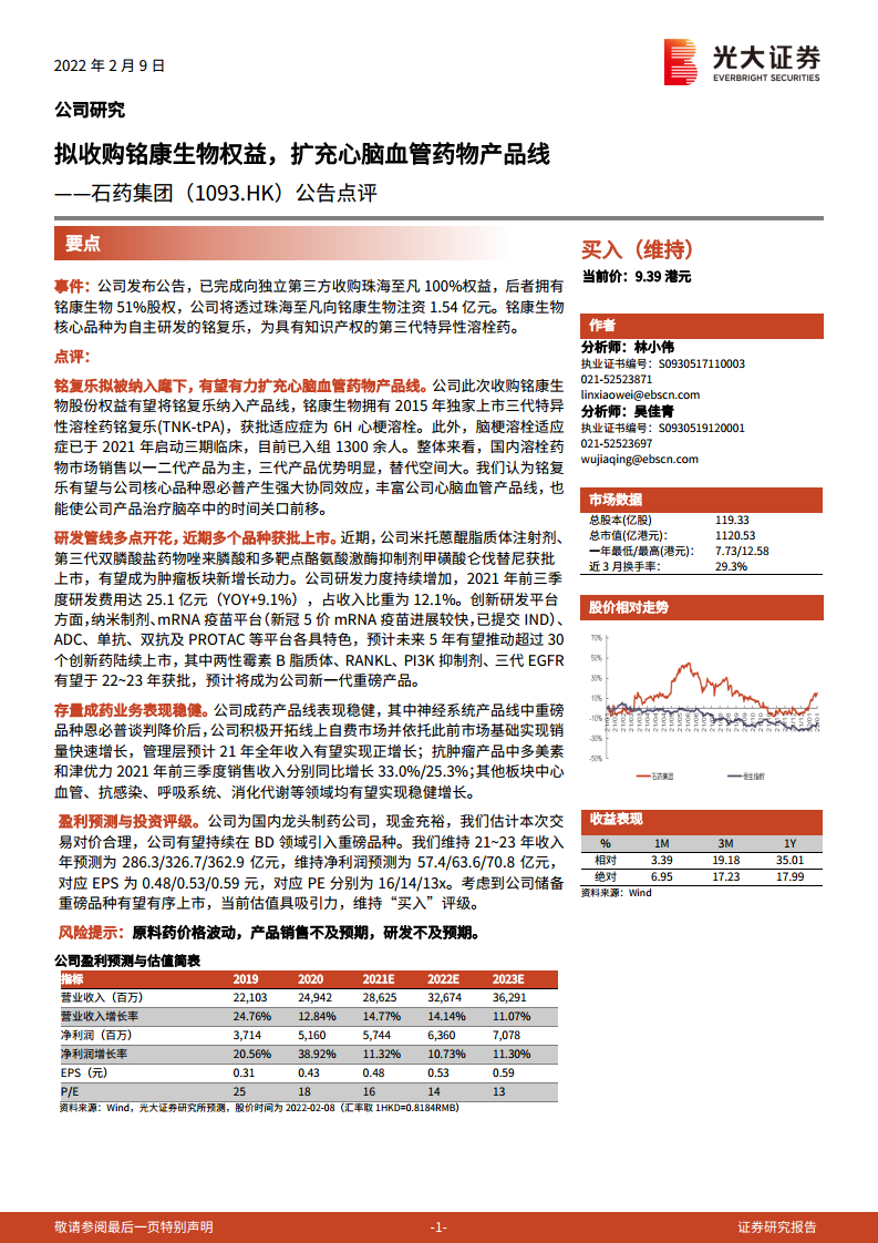 石药集团(01093):拟收购铭康生物权益,扩充心脑血管药物产品线