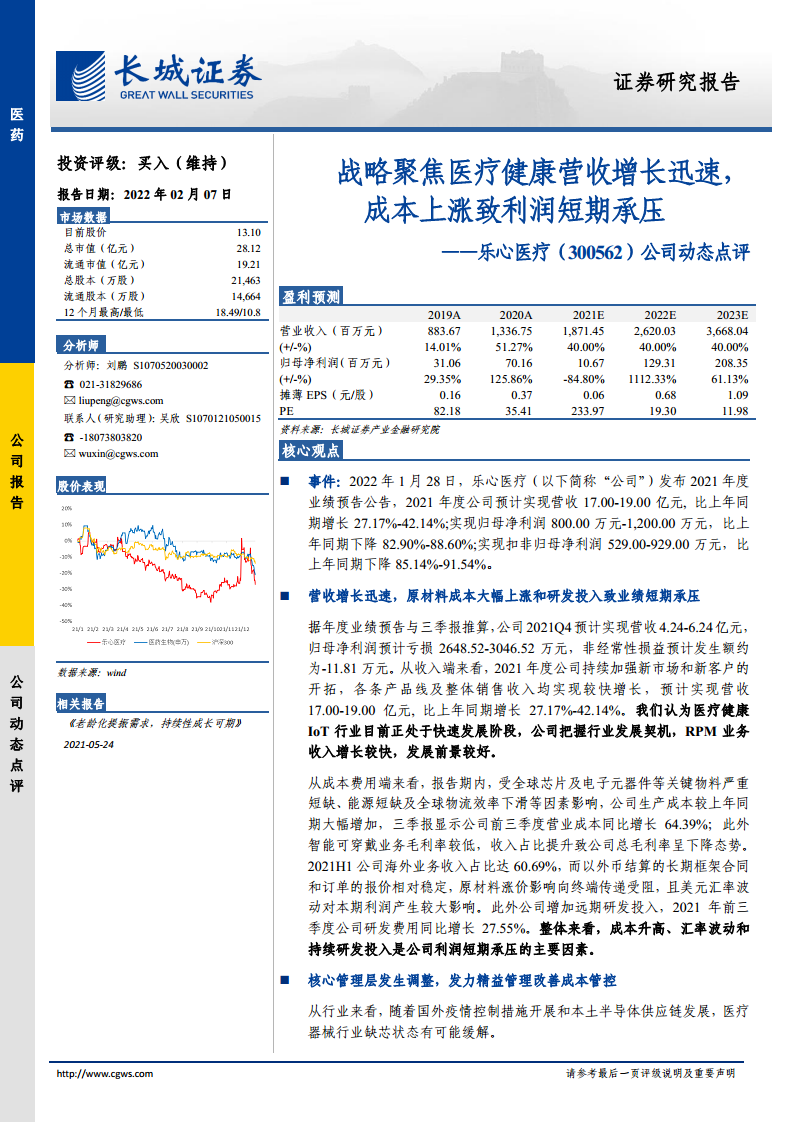 乐心医疗(300562)公司动态点评:战略聚焦医疗健康营收增长迅速,成本上涨致利润短期承压