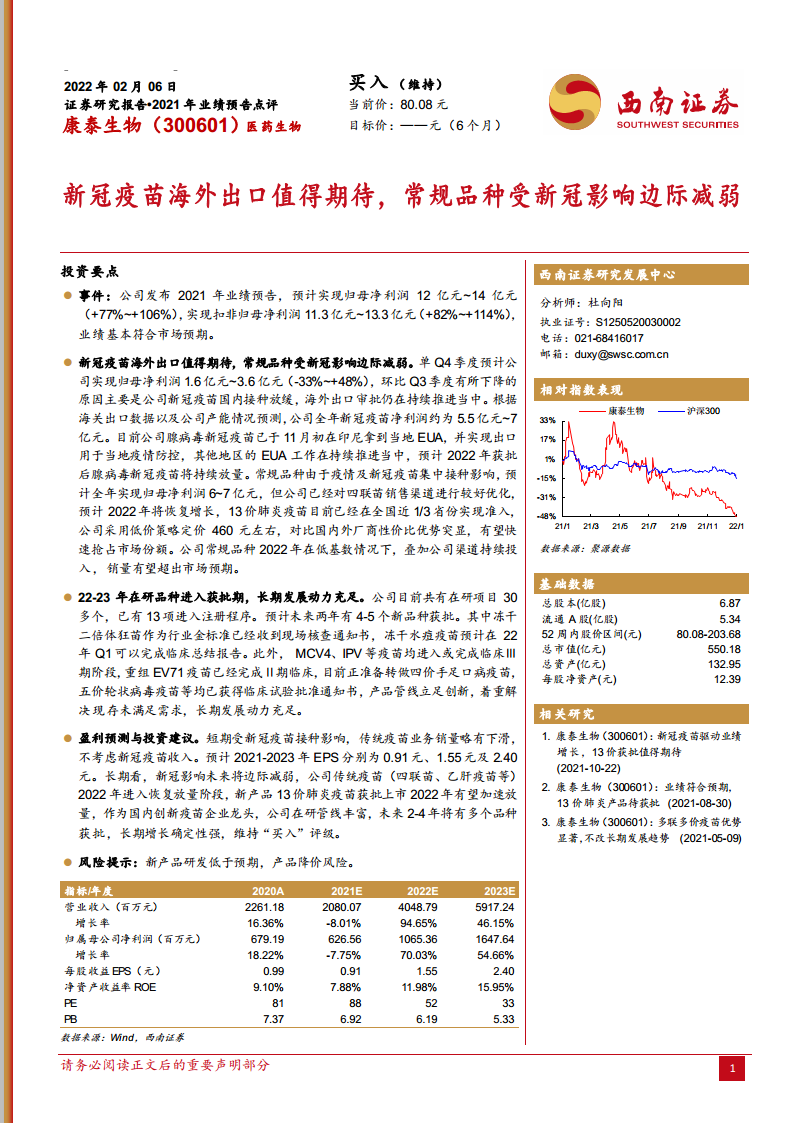 康泰生物(300601):新冠疫苗海外出口值得期待,常规品种受新冠影响边际减弱