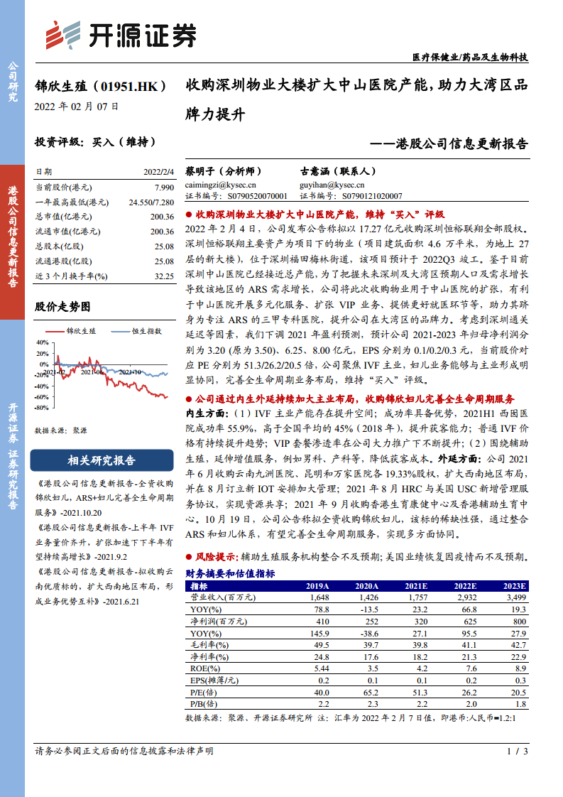 锦欣生殖(01951)港股公司信息更新报告:收购深圳物业大楼扩大中山医院产能,助力大湾区品
