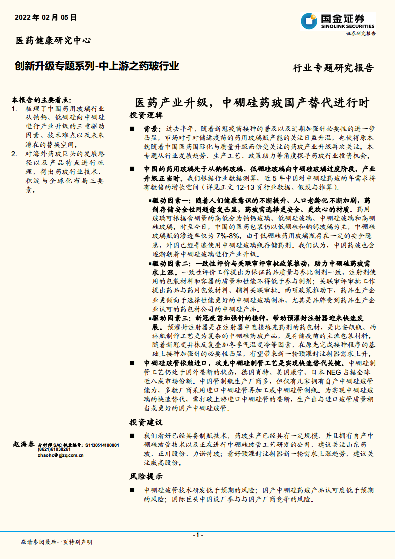 创新升级专题系列-中上游之药玻行业:医药产业升级,中硼硅药玻国产替代进行时