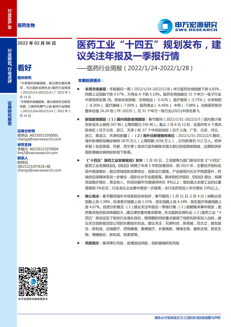 医药行业周报:医药工业“十四五”规划发布,建议关注年报及一季报行情