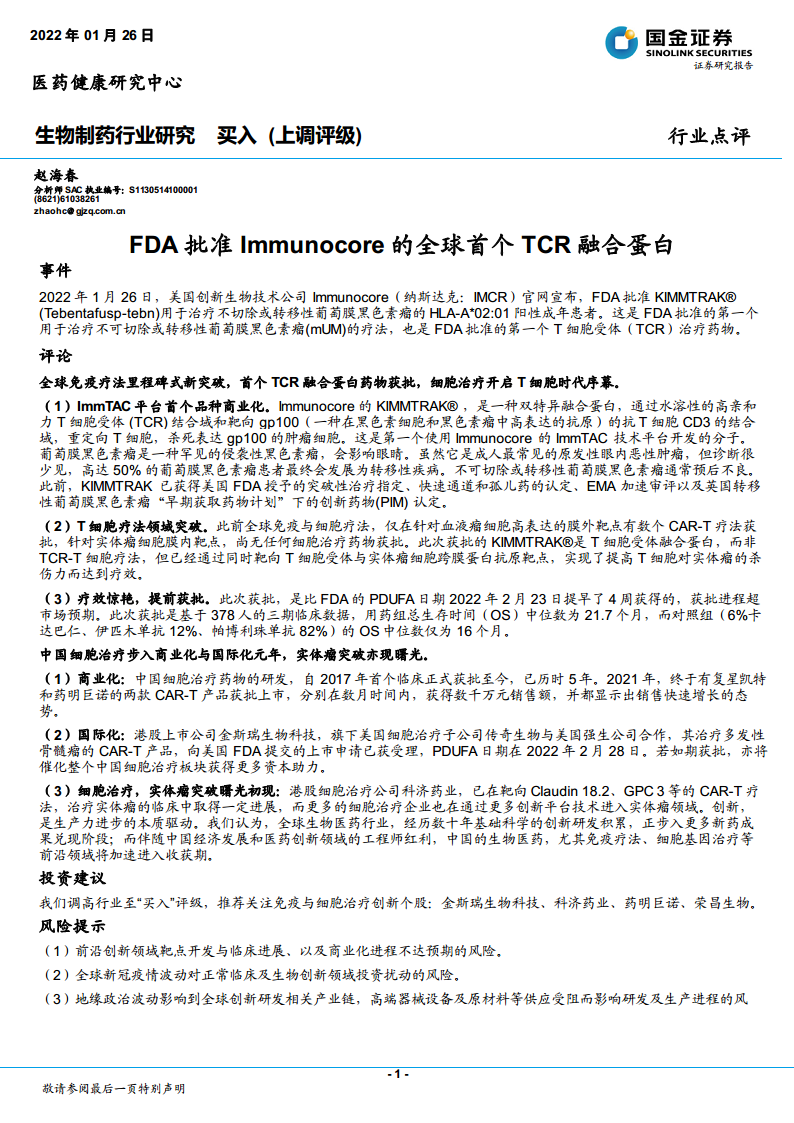 生物制药行业研究:FDA批准Immunocore的全球首个TCR融合蛋白