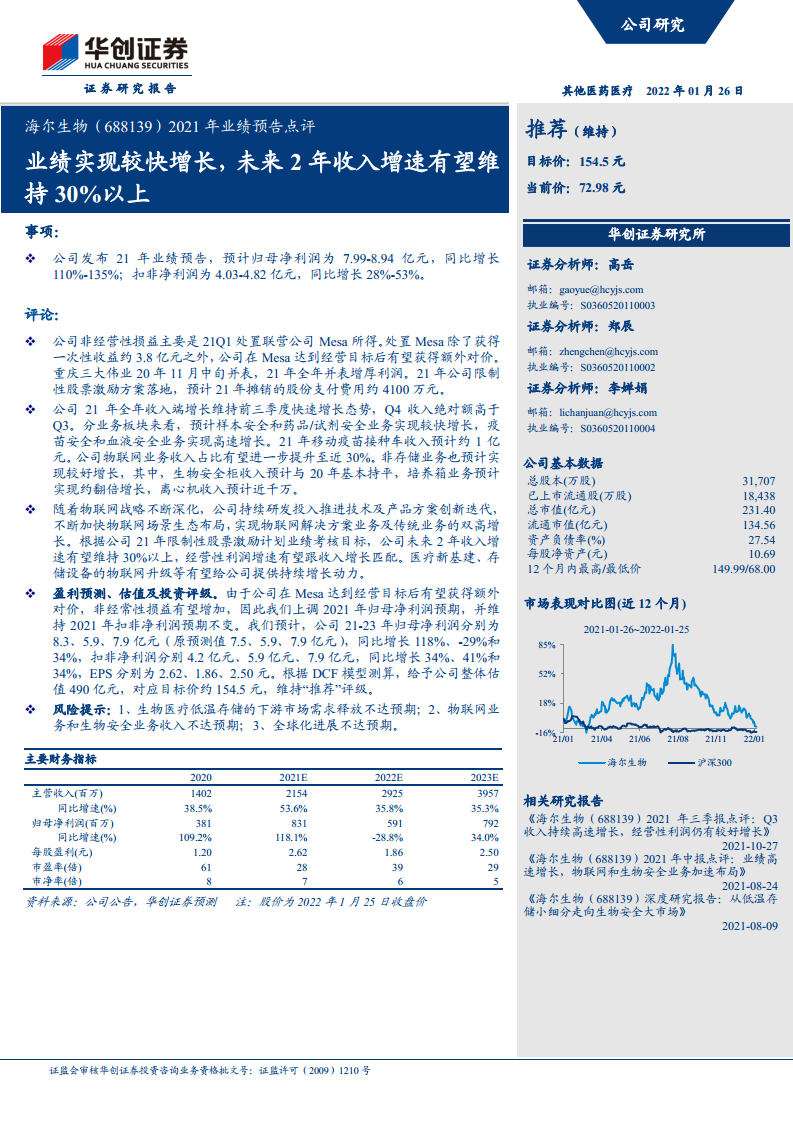 海尔生物(688139)2021年业绩预告点评:业绩实现较快增长,未来2年收入增速有望维持30%以上