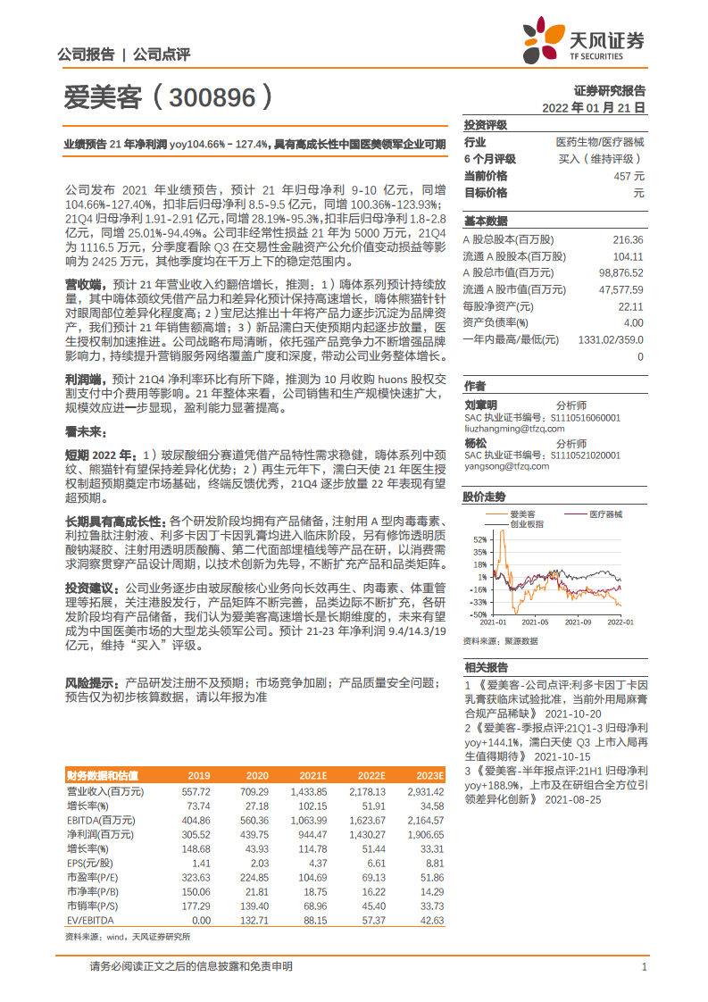 爱美客(300896):业绩预告21年净利润yoy104.66%–127.4%,具有高成长性中国医美领军企业可期
