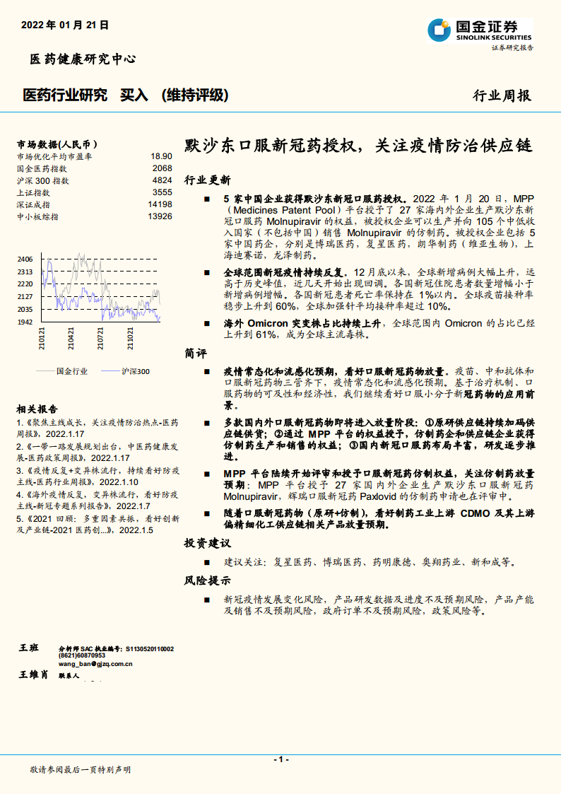 医药行业研究:默沙东口服新冠药授权,关注疫情防治供应链