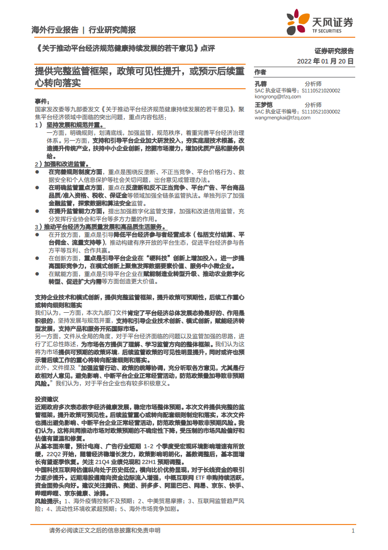 《关于推动平台经济规范健康持续发展的若干意见》点评:提供完整监管框架,政策可见性提升,或预示后续重心转向落实