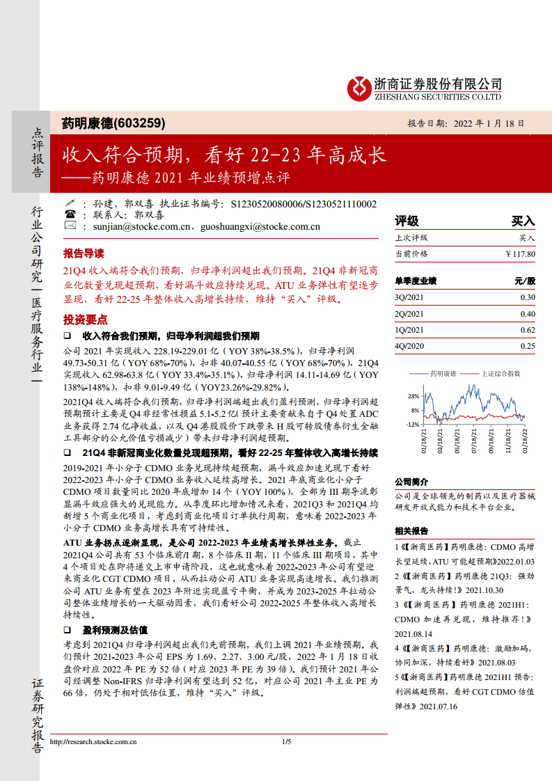 药明康德2021年业绩预增点评:收入符合预期,看好22-23年高成长