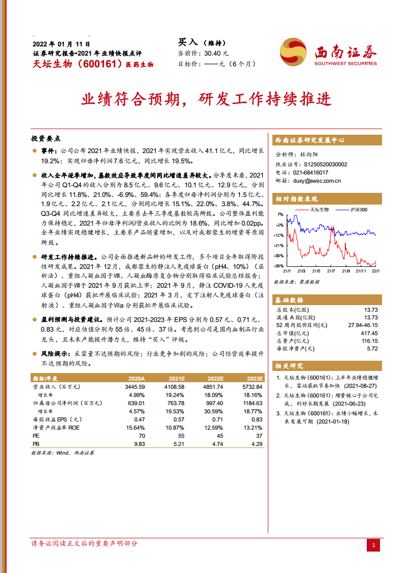 天坛生物(600161):业绩符合预期,研发工作持续推进