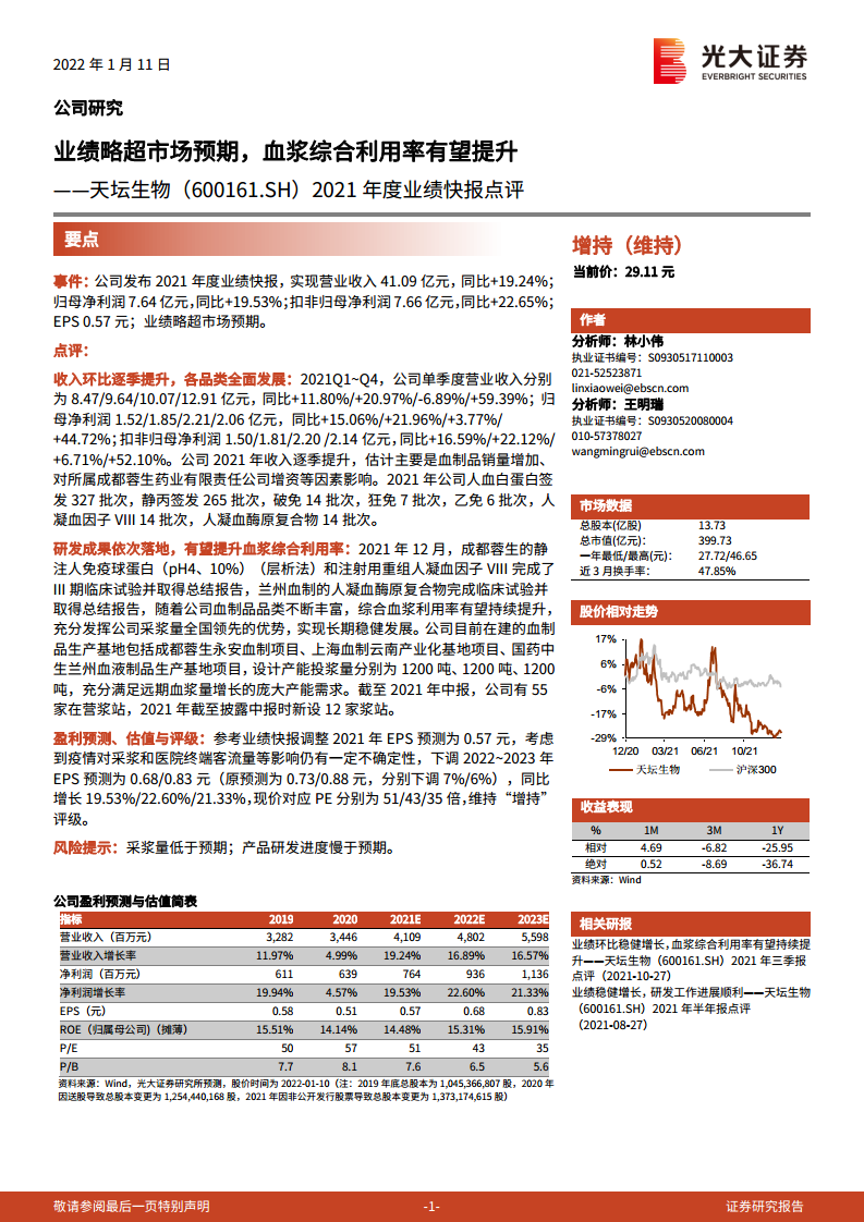 天坛生物(600161):业绩略超市场预期,血浆综合利用率有望提升