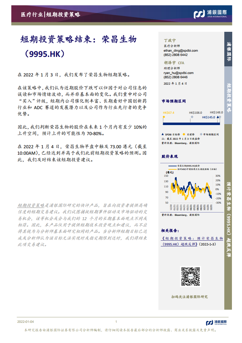 短期投资策略结束:荣昌生物(9995.HK)