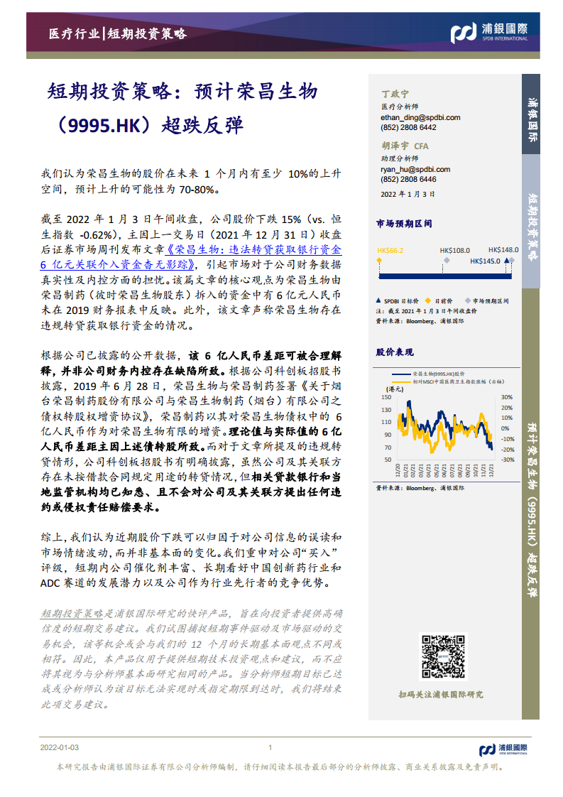 短期投资策略:预计荣昌生物(9955.HK)超跌反弹