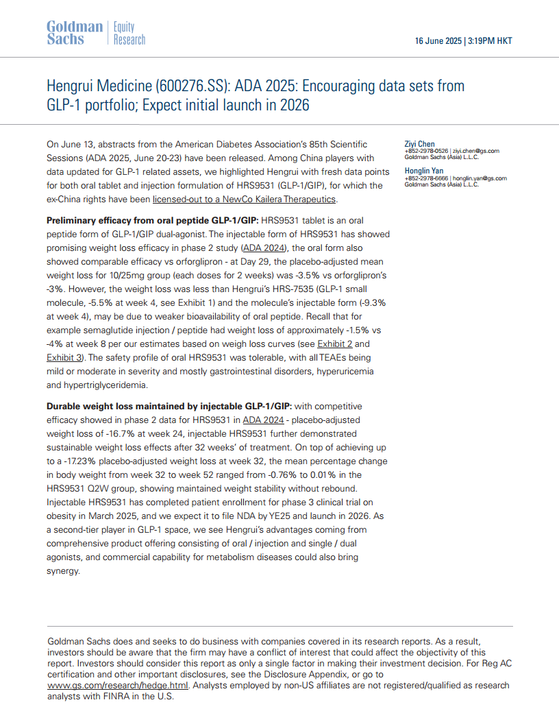 恒瑞医药(600276):恒瑞医药(600276.SS):ADA 2025:GLP-1产品组合的鼓舞性数据集;预计2026年首次推出