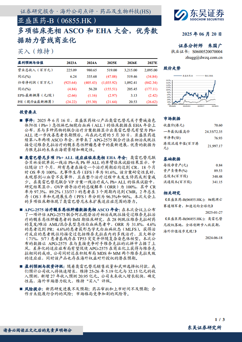 亚盛医药-B(06855):多项临床亮相ASCO和EHA大会,优秀数据助力管线商业化