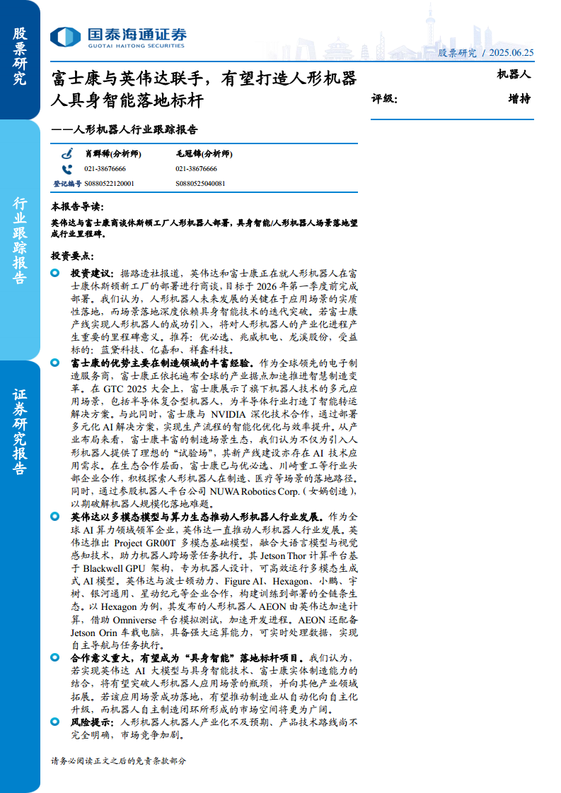 人形机器人行业跟踪报告:富士康与英伟达联手,有望打造人形机器人具身智能落地标杆