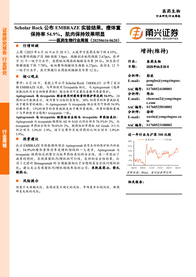 医药生物行业周报:ScholarRock公布EMBRAZE实验结果,瘦体重保持率54.9%,肌肉保持效果明显
