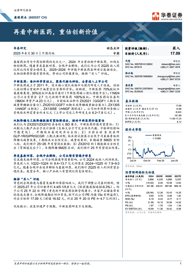 康缘药业(600557):再看中新医药,重估创新价值