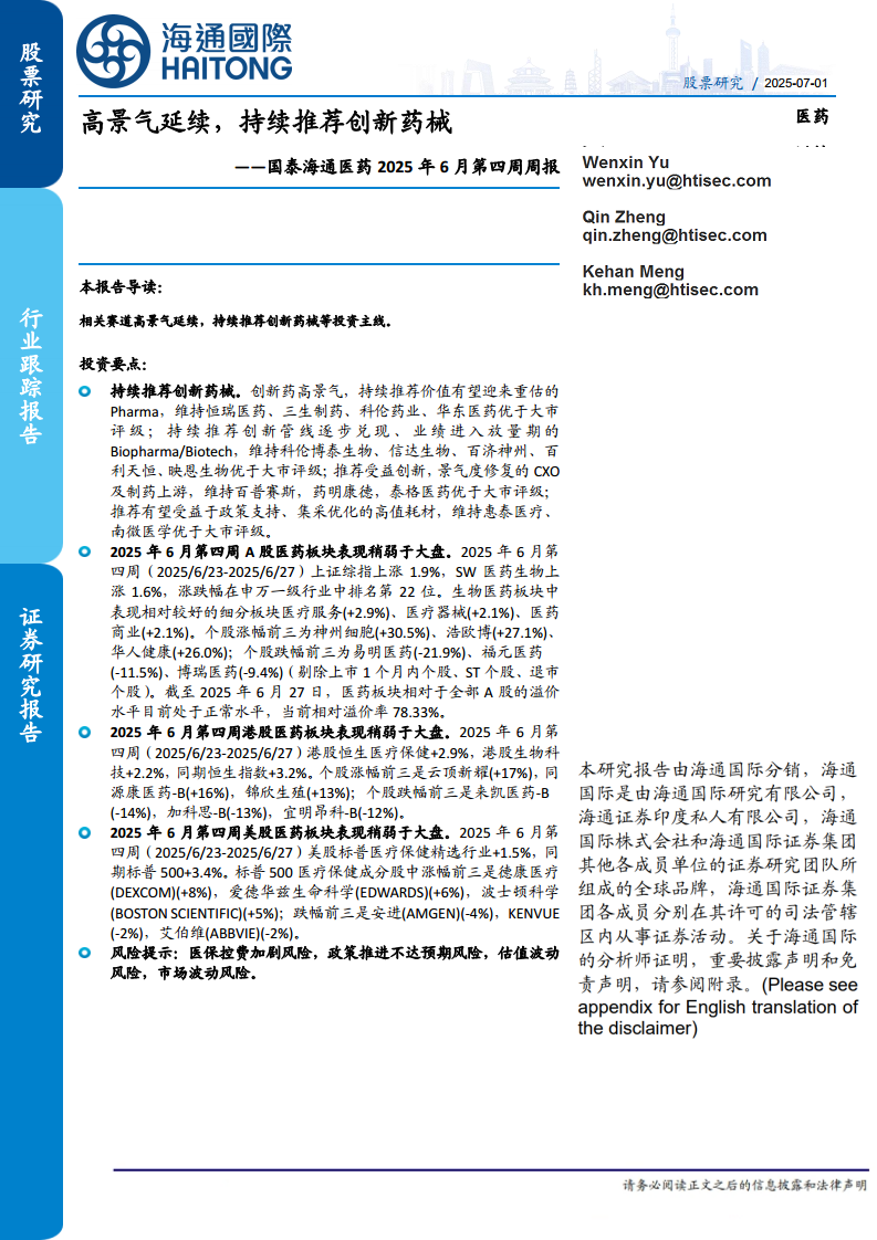 国泰海通医药2025年6月第四周周报:高景气延续,持续推荐创新药械