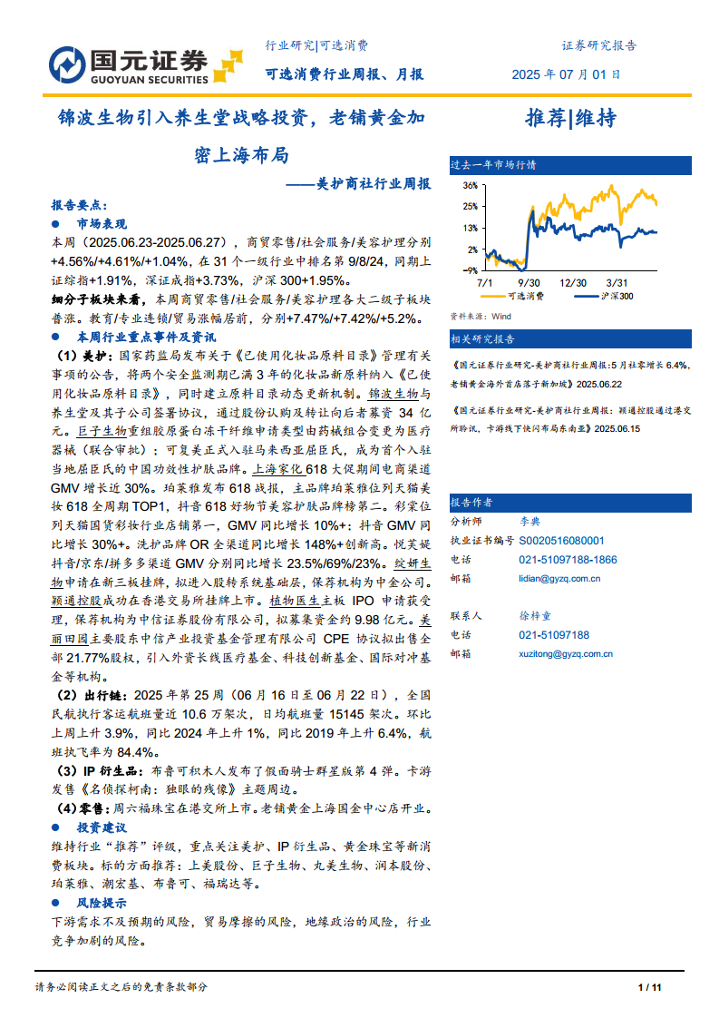 美护商社行业周报:锦波生物引入养生堂战略投资,老铺黄金加密上海布局