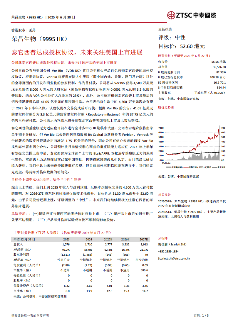 荣昌生物(09995):泰它西普达成授权协议,未来关注美国上市进展
