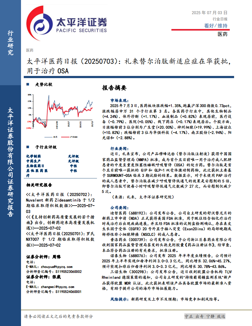 太平洋医药日报:礼来替尔泊肽新适应症在华获批,用于治疗OSA