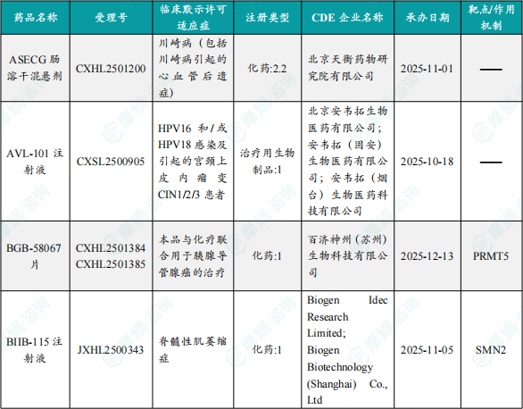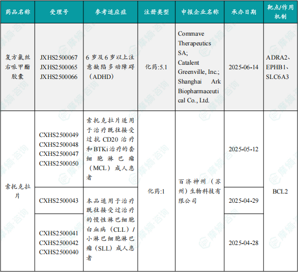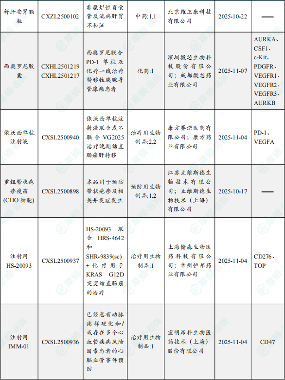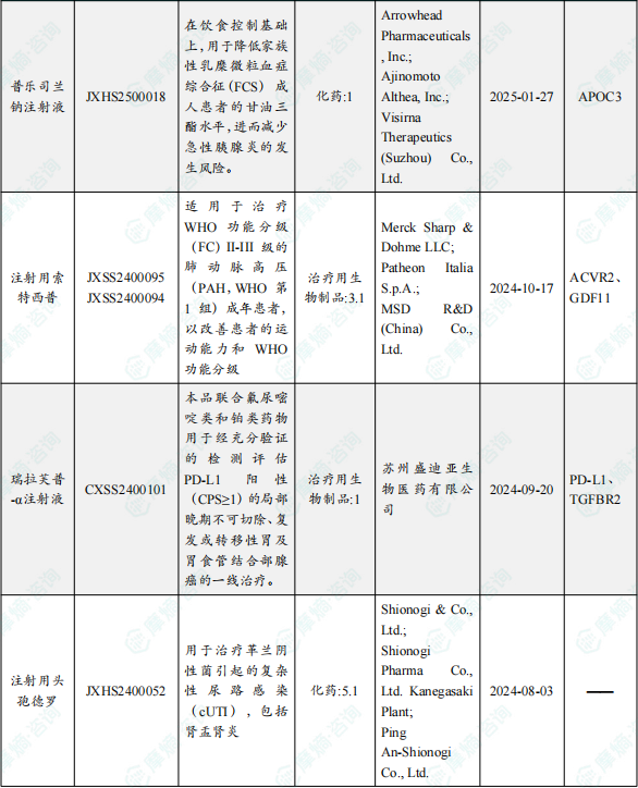 备注:(1)此处未包括补充申请之情形;(2)此处所列创新药/改良型新药,主要是指CDE受理批准的1类、2类、5.1类以及生物制品3.1类和3.2类。(3)更多获批临床信息及研发进展详情及相关靶点全局分析等,可通过摩熵中国药品审评数据库获取并下载EXCEL表格。