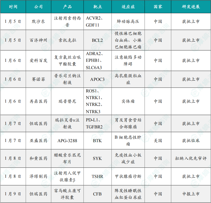 1月5日,NMPA官网显示,百济神州BCL-2抑制剂 索托克拉 两项适应症中国获批上市,适用于治疗既往接受过治疗的慢性淋巴细胞白血病(CLL)/小淋巴细胞淋巴瘤(SLL)成人患者,以及治疗既往接受过抗CD20治疗和BTKi治疗的套细胞淋巴瘤(MCL)成人患者。