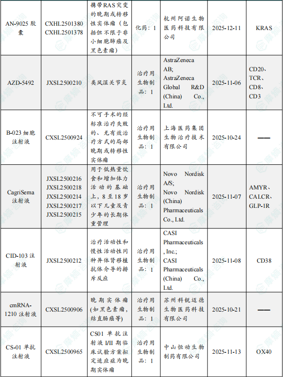 1月14日,CDE官网公示:杭州阿诺生物的 AN-9025胶囊 获得临床试验默示许可,拟用于治疗携带RAS突变的晚期或转移性实体瘤(包括但不限于非小细胞肺癌及黑色素瘤)。