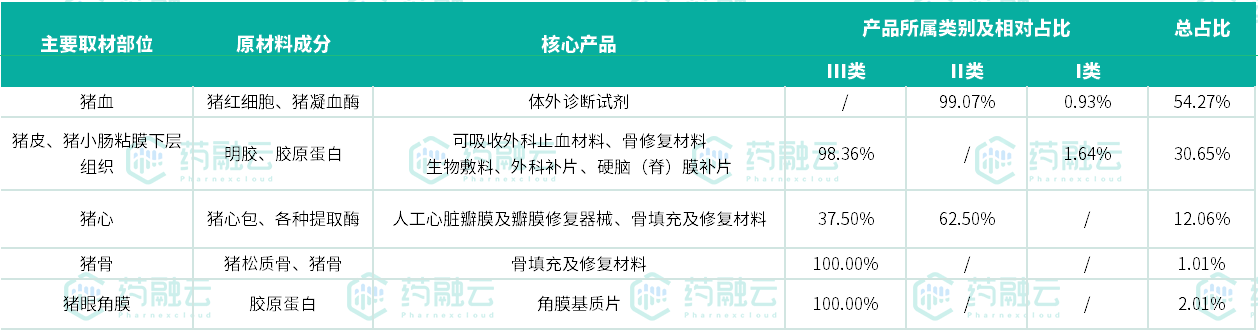 国内猪源性医疗器械取材部位及类别占比
