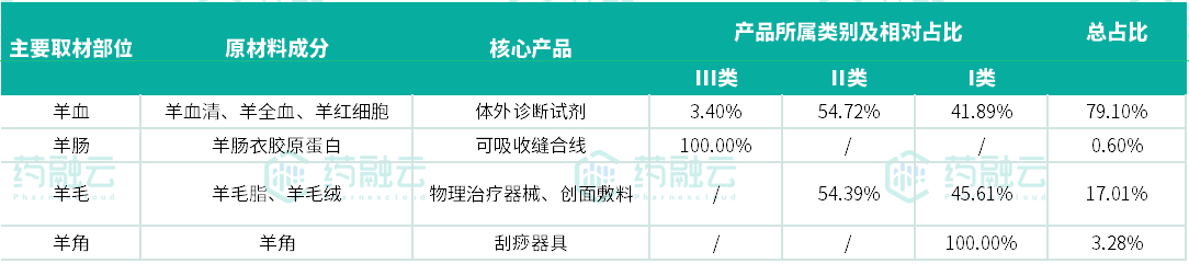 国内上市的羊源性医疗器械中有79.1%为体外诊断试剂,产品类别主要为II类和I类,主要原材料为羊血清、羊红细胞,主要来源为羊血。羊源性植入器械占比较低,且主要为缝合线类、敷料类等中低端产品[2],产品类别主要为III类和II类,主要原材料为羊肠衣胶原蛋白、羊毛脂、羊毛绒,取材部位主要为羊肠和羊毛。此外,跟牛角一样,羊角经加工打磨后也可用做刮痧器具。